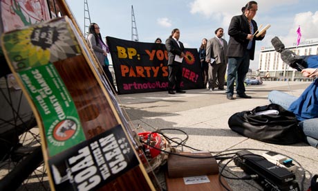 Clayton Thomas-Muller of the Indigenous Environmental Network at a protest outside the BP annual general meeting at the ExCel Centre in London. Photograph: Leon Neal/AFP/Getty Images
