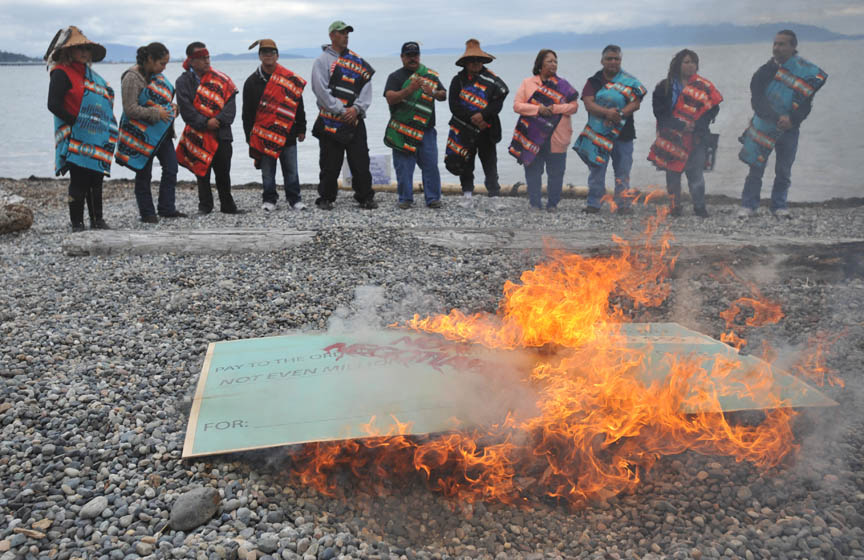 Members of the Lummi Nation protest the proposed coal export terminal at Cherry Point by burning a large check stamped “Non-Negotiable” on the Gulf Road beach west of Ferndale, Wash., Friday afternoon, Sept. 21, 2012, The tribe says they want to protect the natural and cultural heritage of the site. (AP Photo/The Bellingham Herald, Philip A. Dwyer)