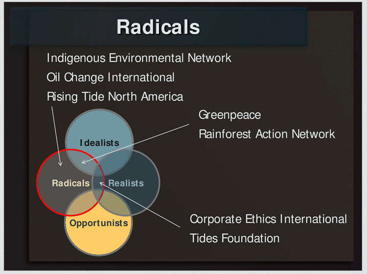 For each of Stratfor’s categories of environmental activist—radicals, idealists, realists and opportunists—the presentation explains how their campaigns are structured and how the fossil fuel industry could deal with them.