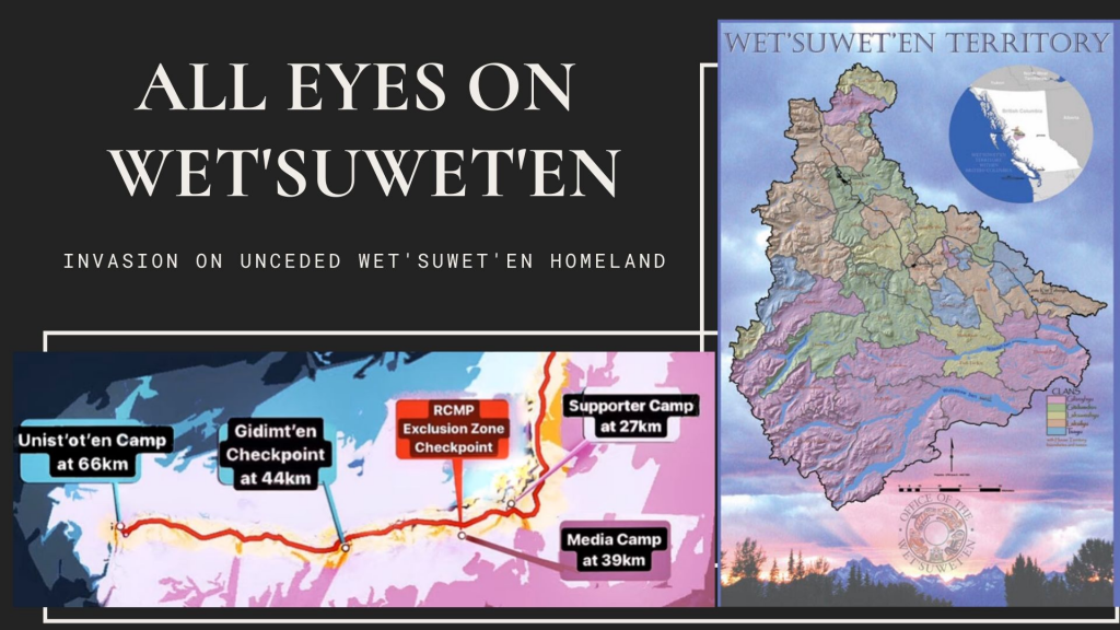 Click here to find the latest update from our Wet’suwet’en relatives. Right now there are world wide actions demanding TC Energy and Coastal GasLink leave Wet’suwet’en sovereign territory.