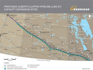 Better known as the Alberta Clipper, the Line 67 pipeline carries heavy crude oil and tar sands bitumen from the Alberta tar sands region south from Hardisty to Superior, Wisconsin and refineries in the midwestern United States.