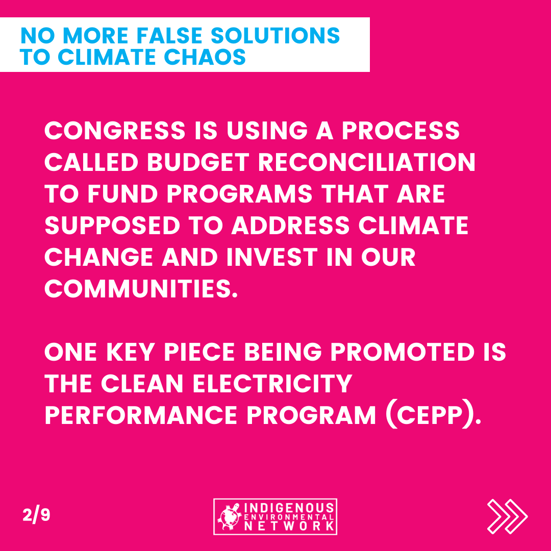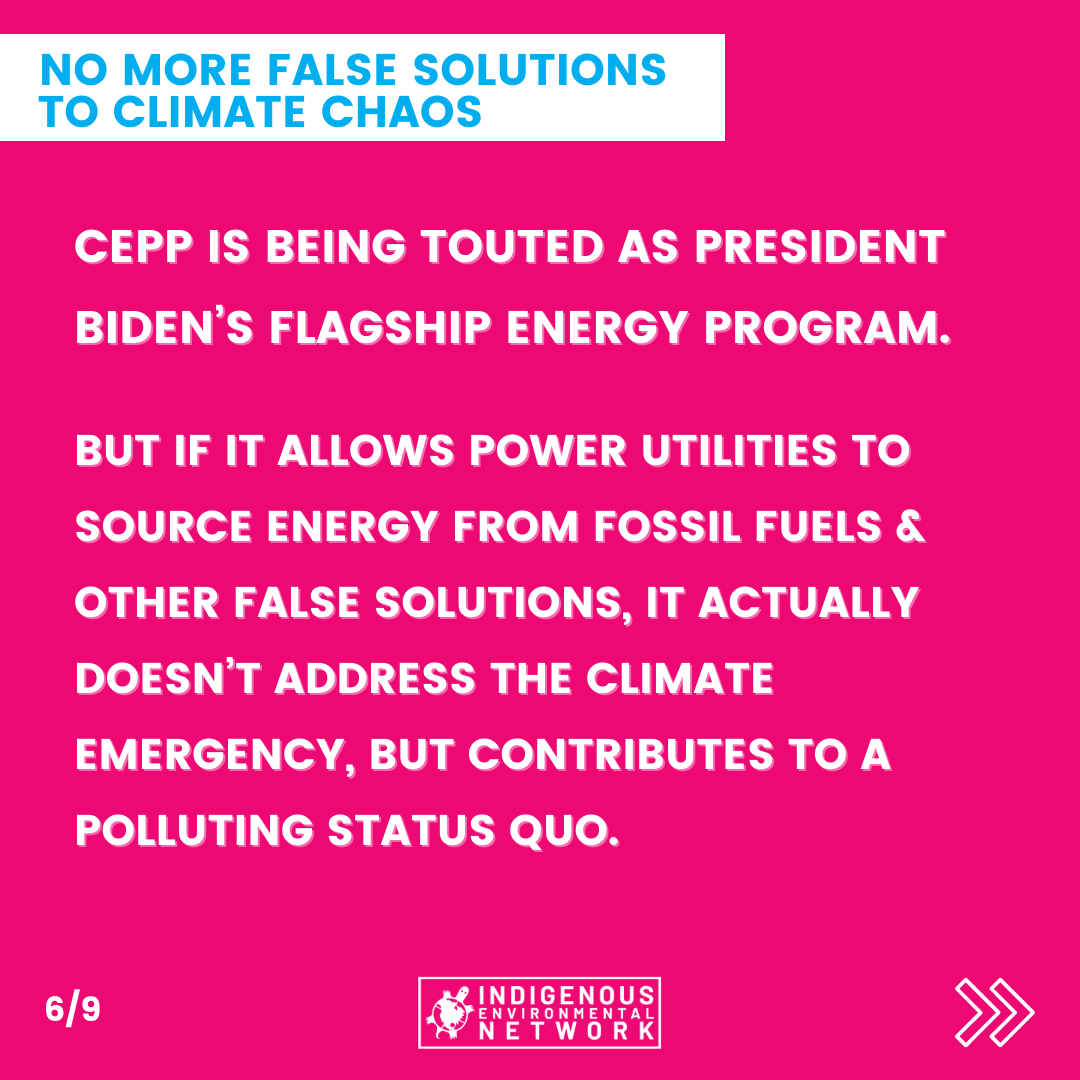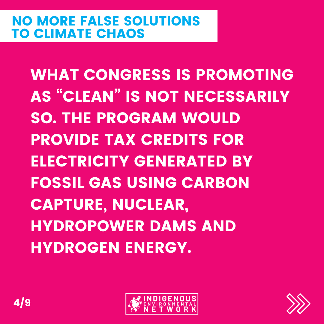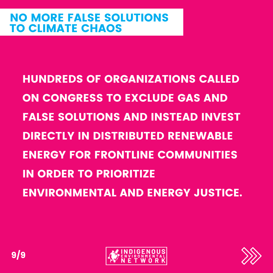 “The flawed concept of ‘technology neutrality’ has been used to provide greenwashing-cover for dirty energies and it enables polluters to skim funding away from renewable energy. Lumping incentives for fossil fuels and false solutions with truly clean and renewable energy sources undermines emission reduction goals and embeds environmental harms,” according to a sign-on letter sent to Congressional leadership by the coalition of NGOs including Indigenous Environmental Network (IEN), Friends of the Earth (FOE), and Food and Water Watch.
