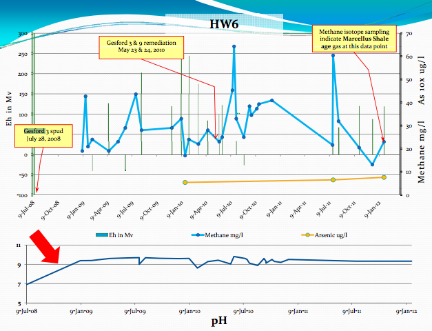 “Methane is released during the drilling and perhaps during the fracking process and other gas well work,” the presentation states. “Methane is at significantly higher concentrations in the aquifers after gas drilling and perhaps as a result of fracking and other gas well work…Methane and other gases released during drilling (including air from the drilling) apparently cause significant damage to the water quality.”