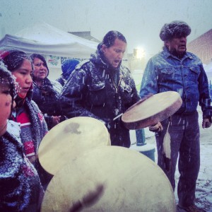 On February 9, 2013, more than 50 people had gathered in downtown Flagstaff for a peaceful Idle No More round dance in protest of Snowbowl ski area expansion and snowmaking with treated sewage on the holy San Francisco Peaks.