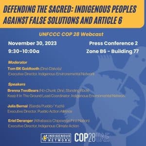 Indigenous Peoples within our international network continued to resist the inclusion of carbon dioxide removals, which would include biological removals, including forests, soils, agriculture and water offsets, our nature-based solutions and engineered removals, including carbon capture and storage, CCS. Many of you are familiar with direct air capture DAC, which are all technologies that are used by the fossil fuel industry to justify more extraction. The private sector that we’re very concerned about participating in, these spaces have a terrible history of violating the rights of indigenous people. So the rights and inherent rights of Indigenous Peoples is very critical to us in our organization as well as with Indigenous Peoples from the north to the south, especially the Pacific Islands.