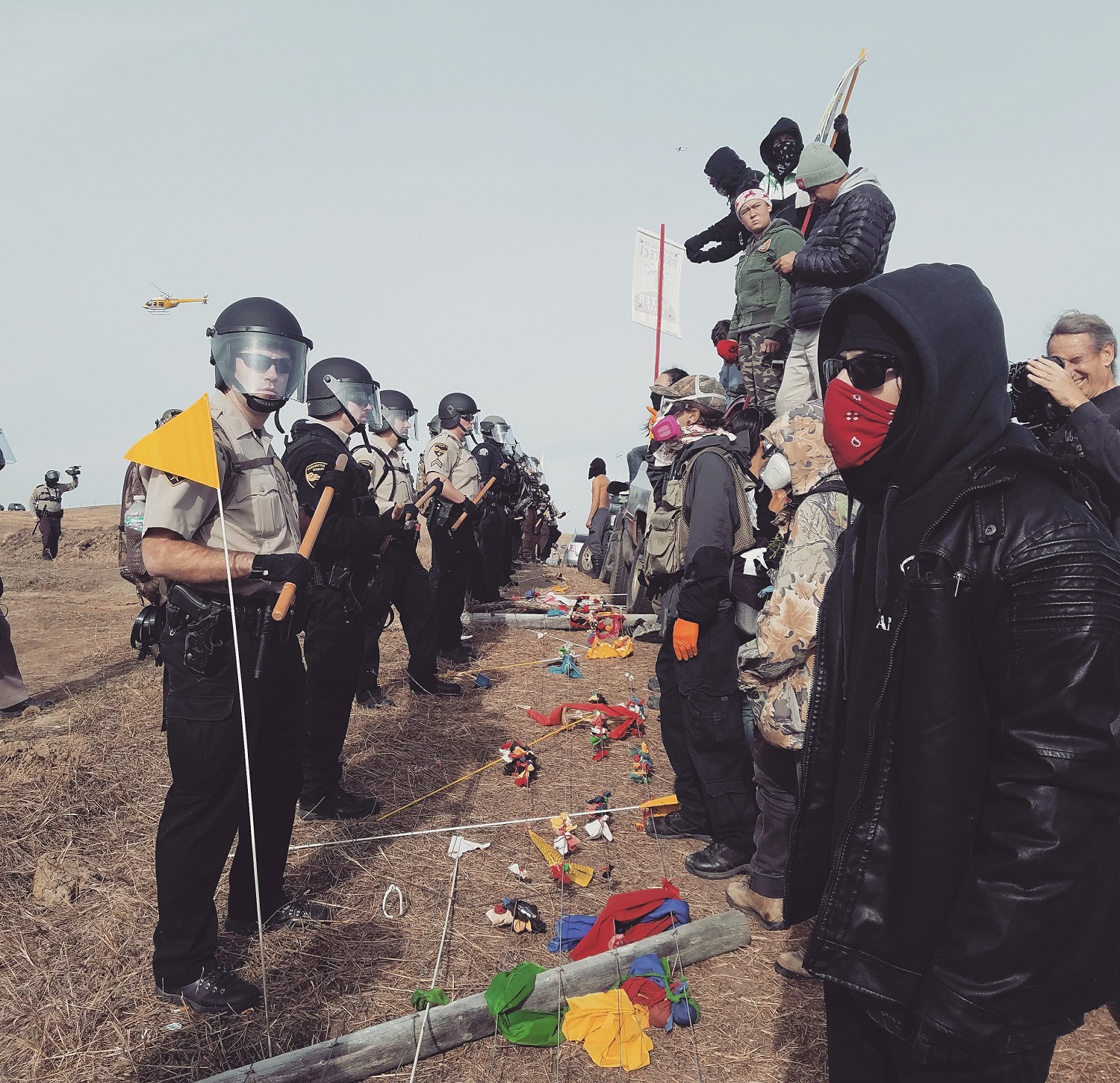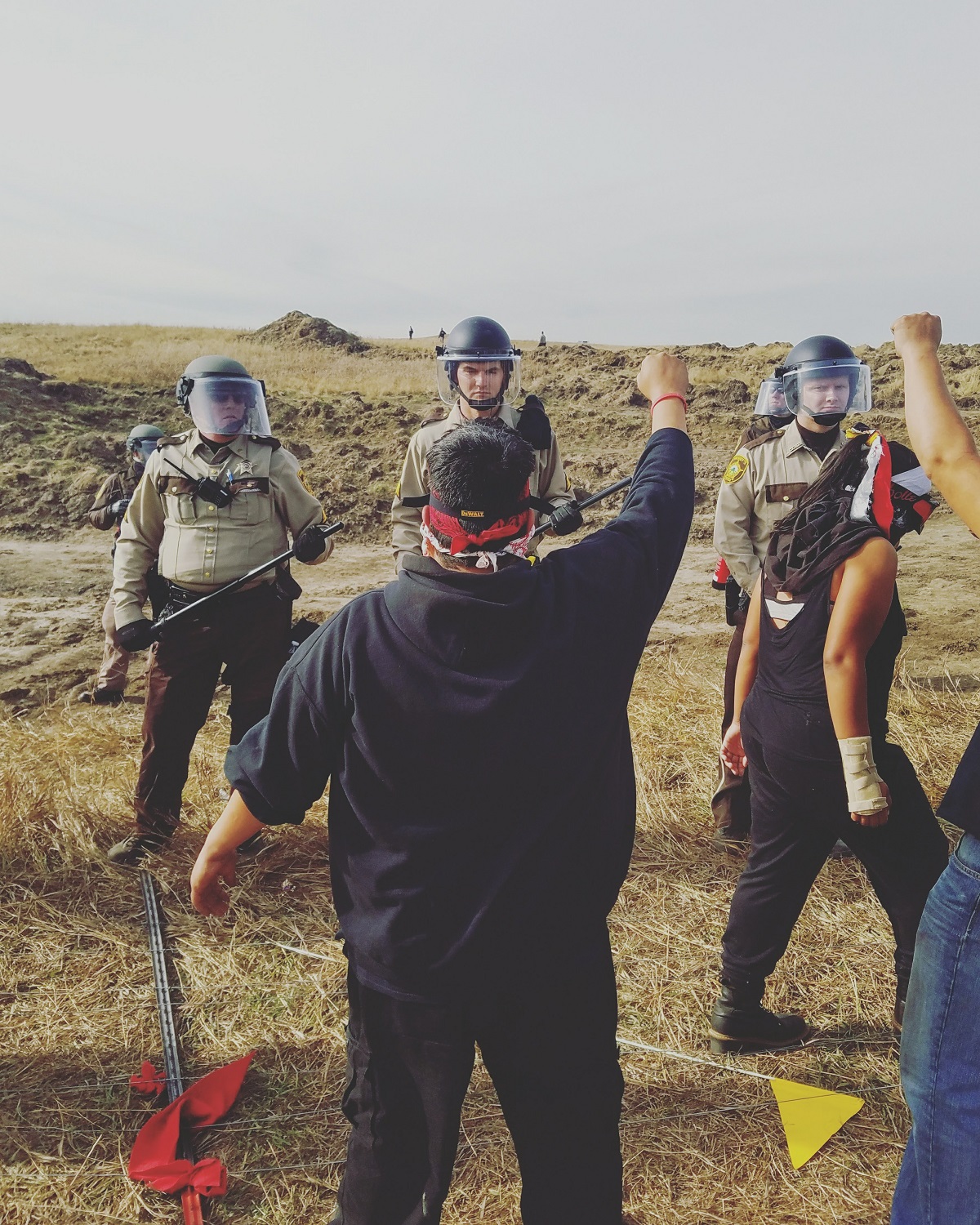 Anishinaabe land defender faces off against North Dakota police forces, Standing Rock 2016, photo courtesy of Indigenous Environmental Network.