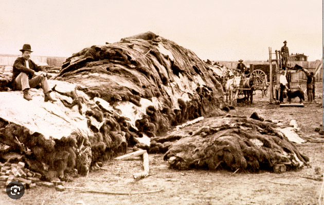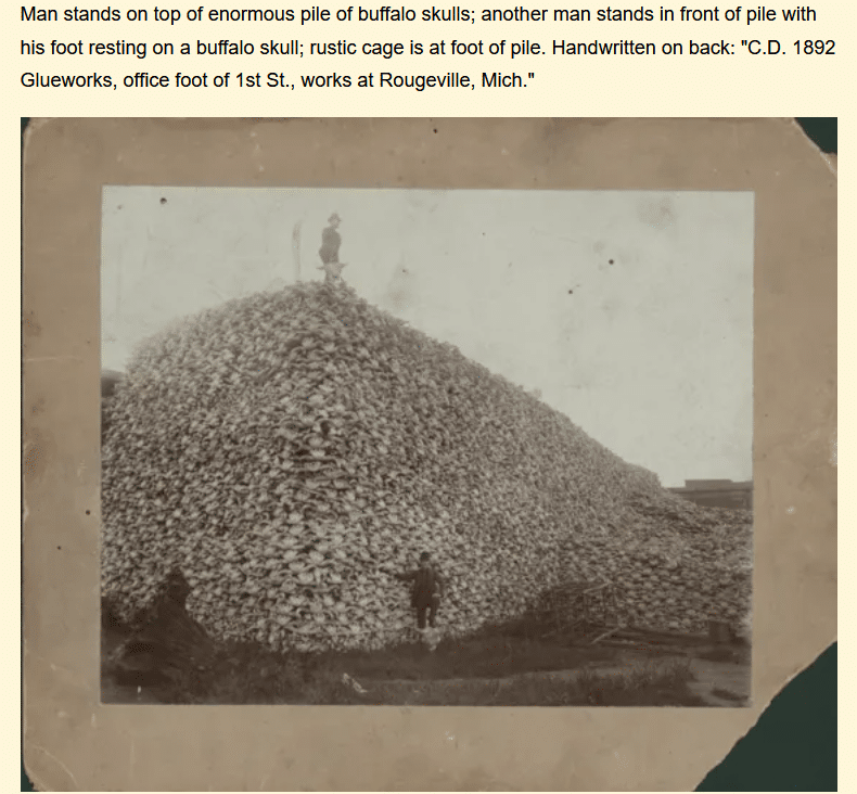 The Kiowa could not hold their sacred life-sustaining Sundance without a buffalo bull skull, and they called the year 1879, the “Horse-eating Time,’ when they were near starvation, as were many other Indigenous Peoples. Comanche leader Quanah Parker – his people going hungry, confined to a reservation, unable to find any bison – finally received permission to take a handful of hunters off-reservation only to find rotting bison corpse after corpse, so many that the piles of decaying flesh could be smelled for miles – but no live buffalo for meat.