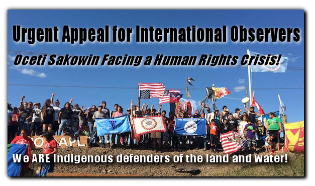 We, the Indigenous defenders of the land and water within the traditional treaty lands of the Oceti Sakowin, make an urgent appeal to the international community to assist us in facing a human rights crisis. Dakota Access is trying to put a crude oil pipeline under the Missouri River. This is a dire threat to the drinking water and future generations of the Oceti Sakowin who have lived here for generations.